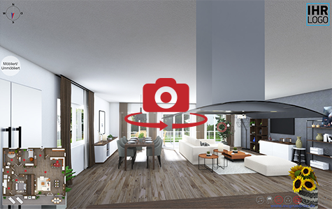 Der 360°-Rundgang kann durch verschiedene Optionen und Funktionen wie z.B. möbliert/unmöbliert, Fotogalerie, Hintergrundmusik, interaktiver Nordpfeil oder Intro mit Firmenlogo, den eigenen Anforderungen angepasst werden.