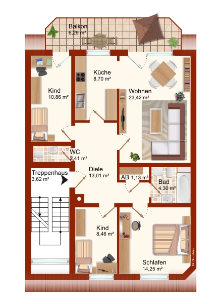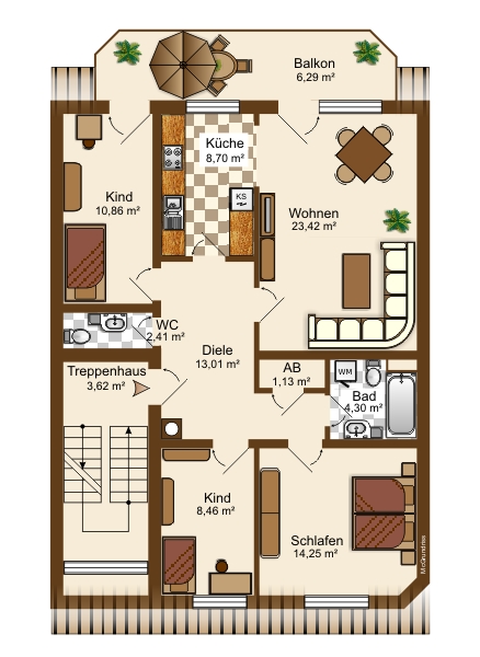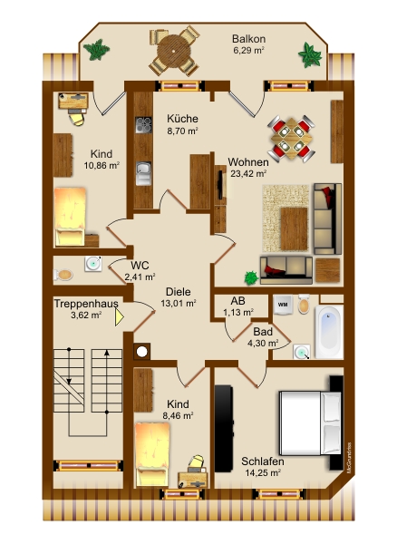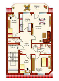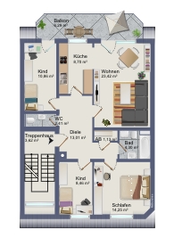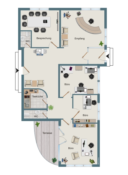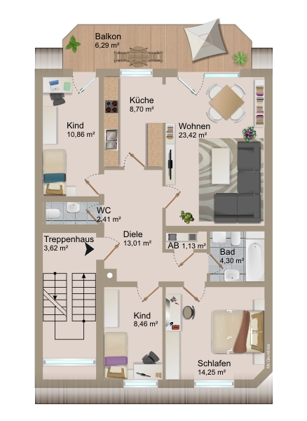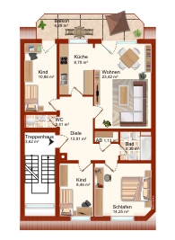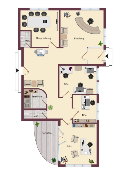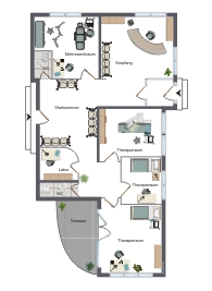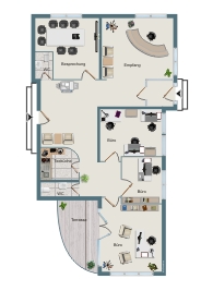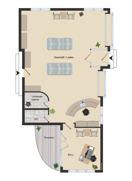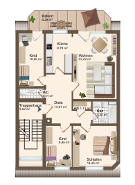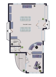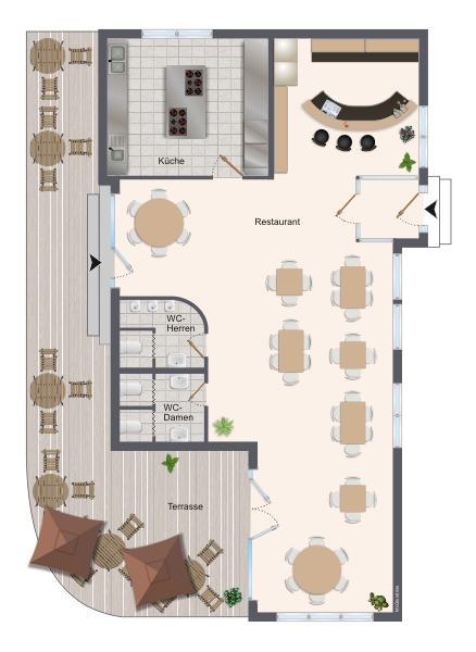 Stilvolle und realitätsnahe Draufsicht mit vielen Details, verschiedenen Möblierungen und interessanten Optionen.